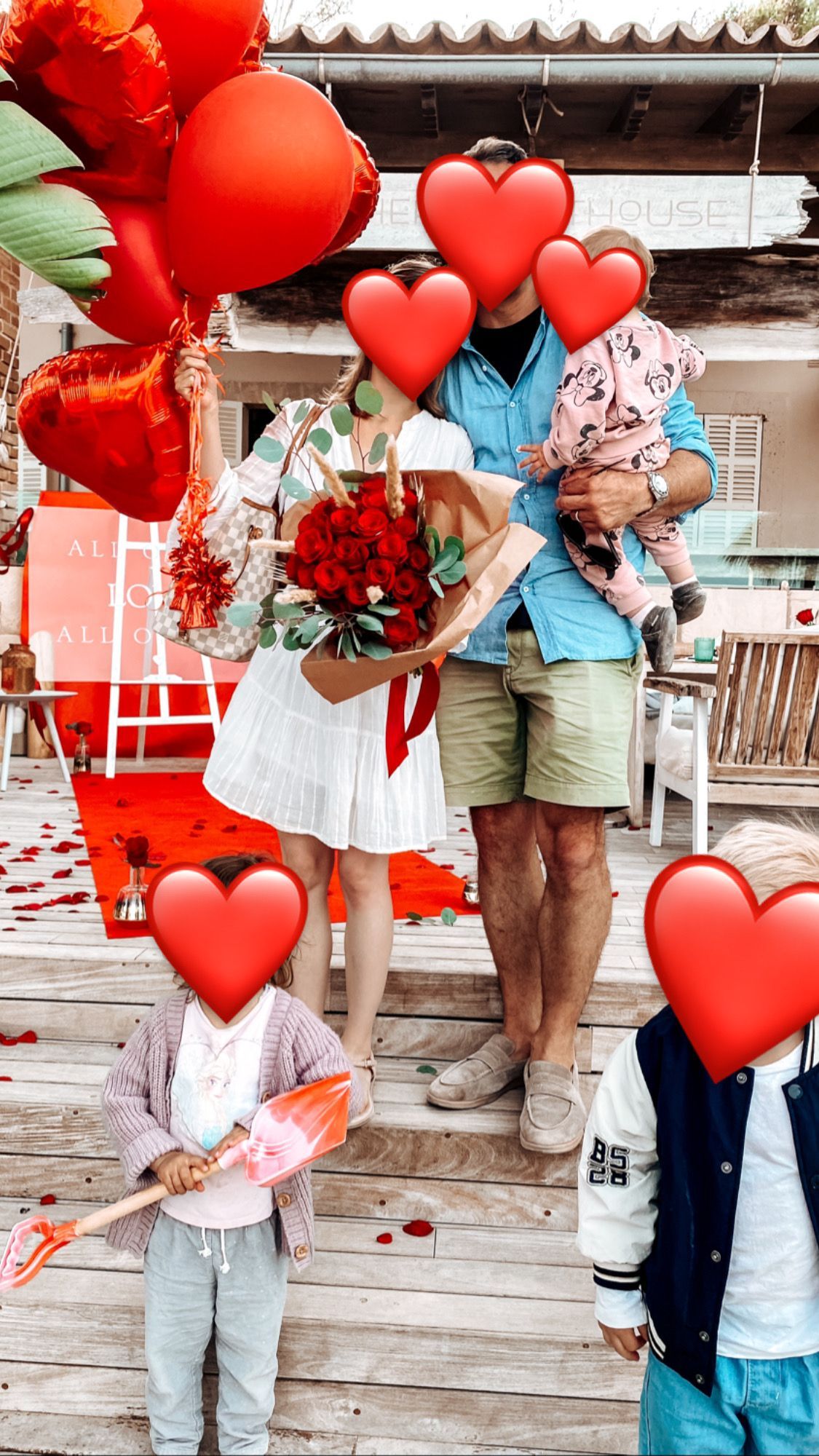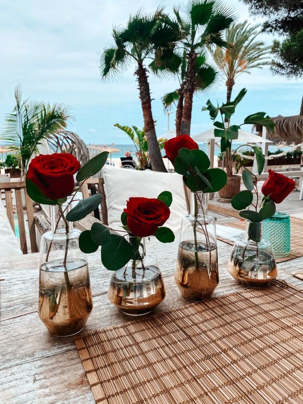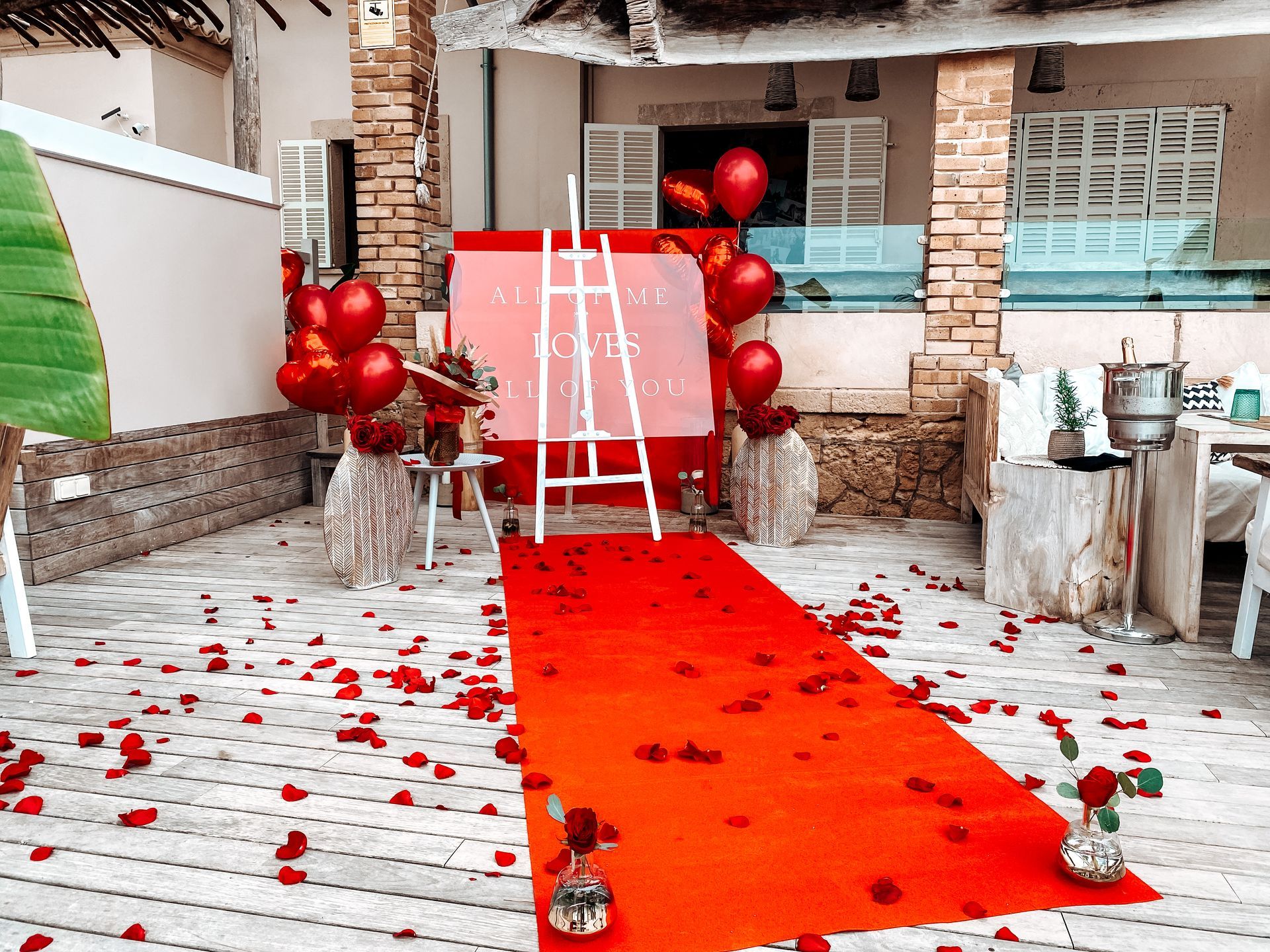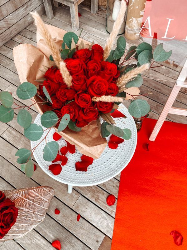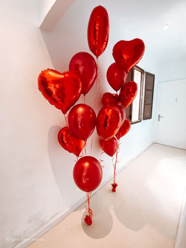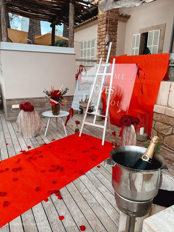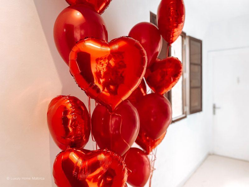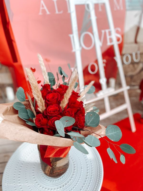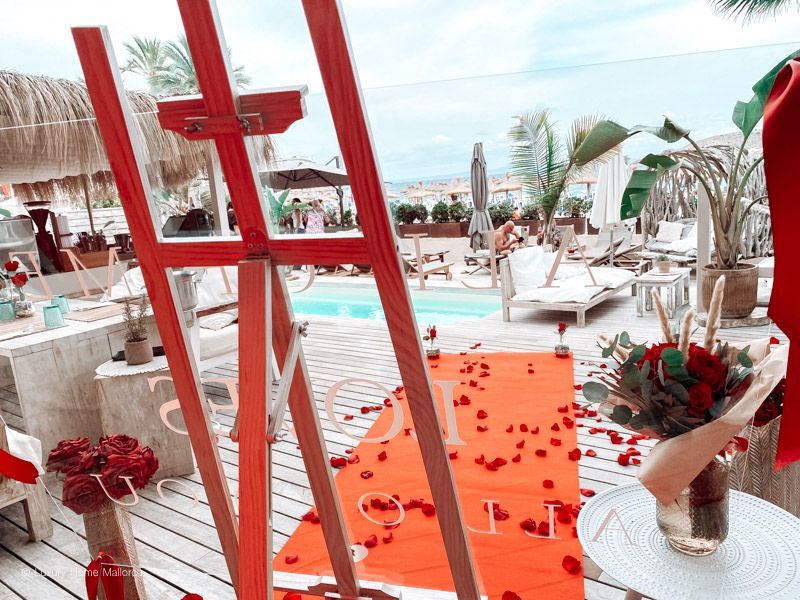 Wir bauen für Euch ein großes Schild auf, sowie Rosenblätter und Rosen zusammen mit Helium Ballons in Eurer privaten Location, Finca, Villa oder Restaurant auf.