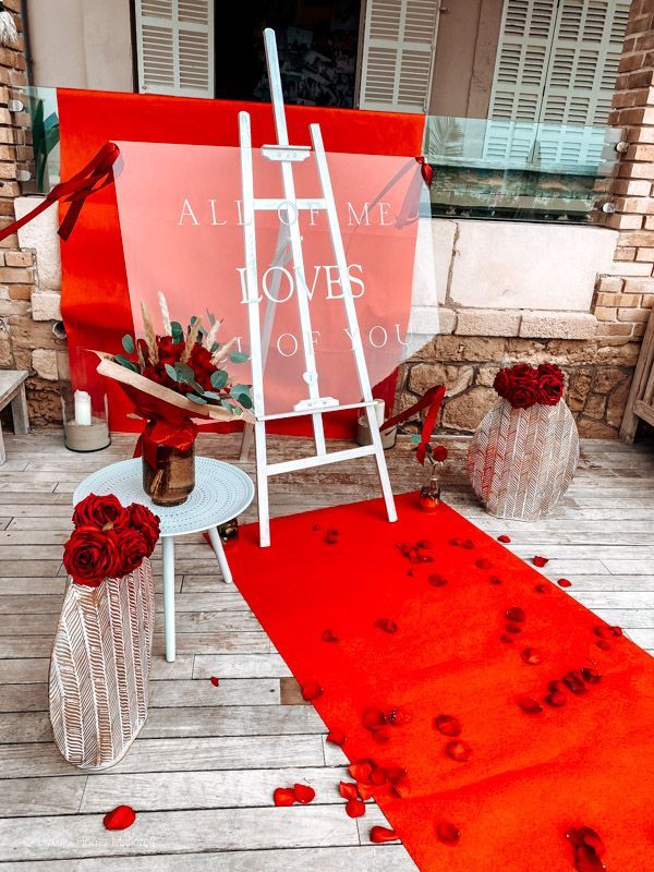 Verlobung in Finca oder RestaurantGroßes Schild mit Red Carpet, Blumen und Helium Ballons für Deine Verlobung