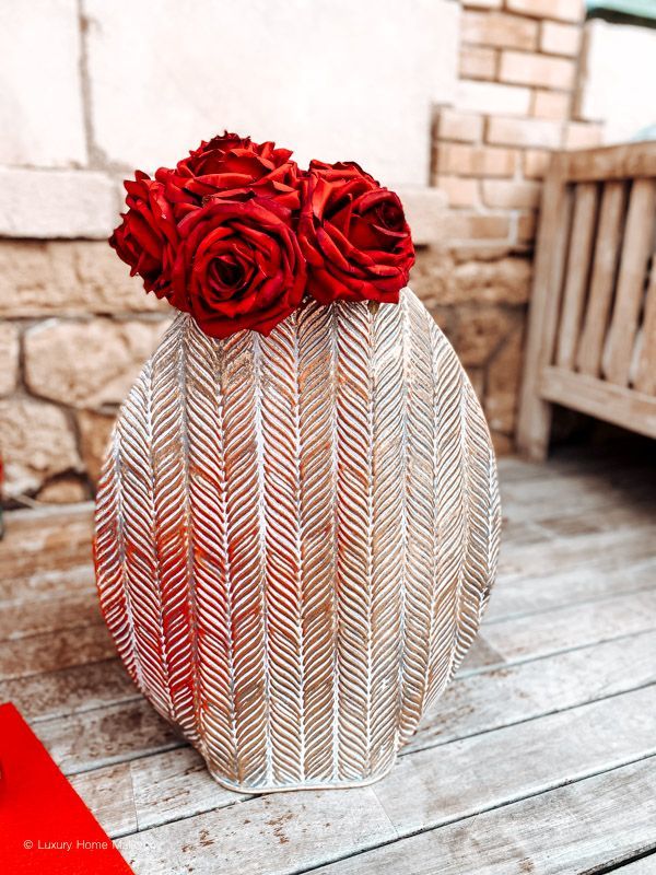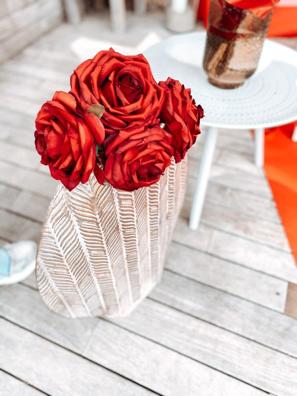 - Rosen in Vasen sowie gestreute Rosenblätter